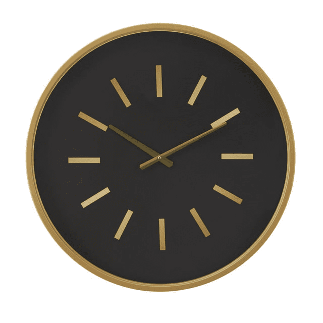 This wall clock features a black clock face as well as a gold frame, clock hands, and line markings