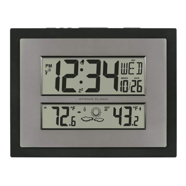 Add a warm and inviting flair to your adult home with this two-tone digital atomic time and date clock. In a bedroom or dining room, the elegant timepiece offers more character with its unique design. Accurate to the second atomic digital time automatically sets time and adjusts to daylight savings time if you prefer. Displays temperatures in either fahrenheit or celsius and offers 330 feet range from wireless transmitting sensor. Battery operated for added convenience.
