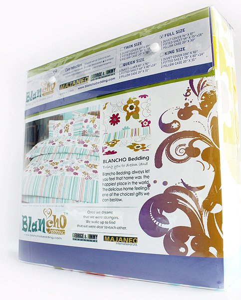 Three-piece set for Twin size (consisting of a pillow sham, a fitted sheet & a duvet cover). Four-piece set for Full, Queen and King Size (consisting of two pillow shams, a fitted sheet & a duvet cover). Twin (Fitted sheet : 39 x 75 inches; Duvet cover : 67 x 87 inches; Pillow sham: 20 x 30 inches); Full (Fitted sheet : 54 x 75 inches ; Duvet cover : 76 x 87 inches; Pillow sham: 20 x 30 inches); Queen (Fitted sheet : 60 x 80 inches; Duvet cover : 87 x 90 inches; Pillow sham: 20 x 31 inches); King (Fitted sheet : 78 x 80 inches; Duvet cover : 104 x 92 inches; Pillow sham: 20 x 31 inches); *Blancho Bedding products are all made of high quality certified fibers, highest quality construction, chemical and fire retardant free. Allergy-free nontoxic natural bedrooms is our specialty. You won't find any similar quality products at low prices as our products. *The concealed elastic band in the fitted sheet will firmly wrap the overall corners of the mattress, thus avoiding displacement. The design of extending the pocket size of the fitted sheet to 14 inches will fit with the most of mattresses. *We recommend duvet covers because they can be washed much more often than can your quilted comforter. Too-frequent washing (even dry cleaning) can compromise your comforter's down fill. However, a cotton duvet cover can be laundered along with the sheets and pillowcases. This keeps the down comforter fresh as well. If you have ever priced dry cleaning for a fine comforter, you understand why cleaning it less often is a huge advantage! *Another advantage of cotton duvet covers is that they are changeable, so you can change the look and feel of your bedroom without having to completely redecorate. Browse our colorful duvet cover sets and bring excitement to your bedroom. Full size, consisting of two pillowcases, a fitted sheet and a duvet cover. High Density Fabrics, 100% certified cotton fabric; Environment-friendly dyes. Showing the styles of colorfulness and ebullience via the fashionable designs. Shrinkproof, anti-pilling and fading proof processes; 14 inches pocket size of the fitted sheet. Fine and concentrated stitches; Machine washable and dryable.