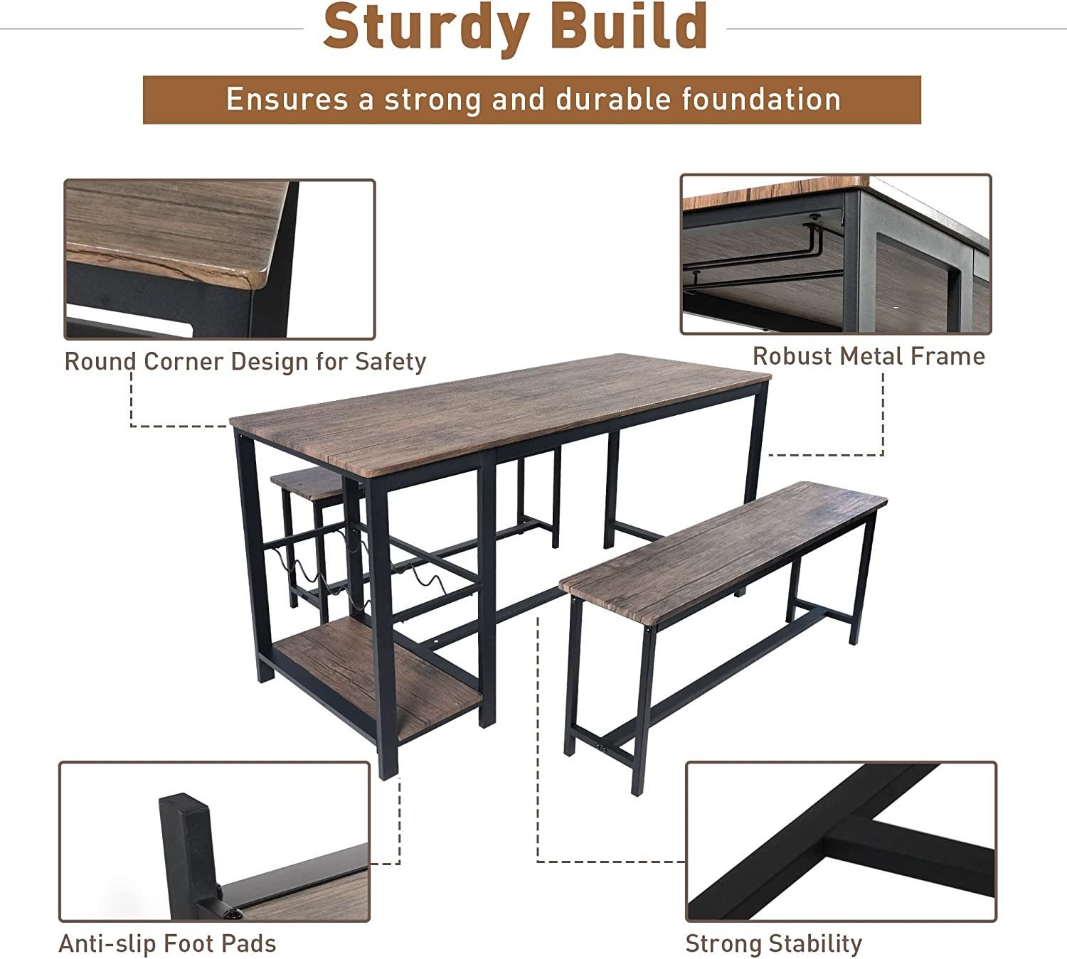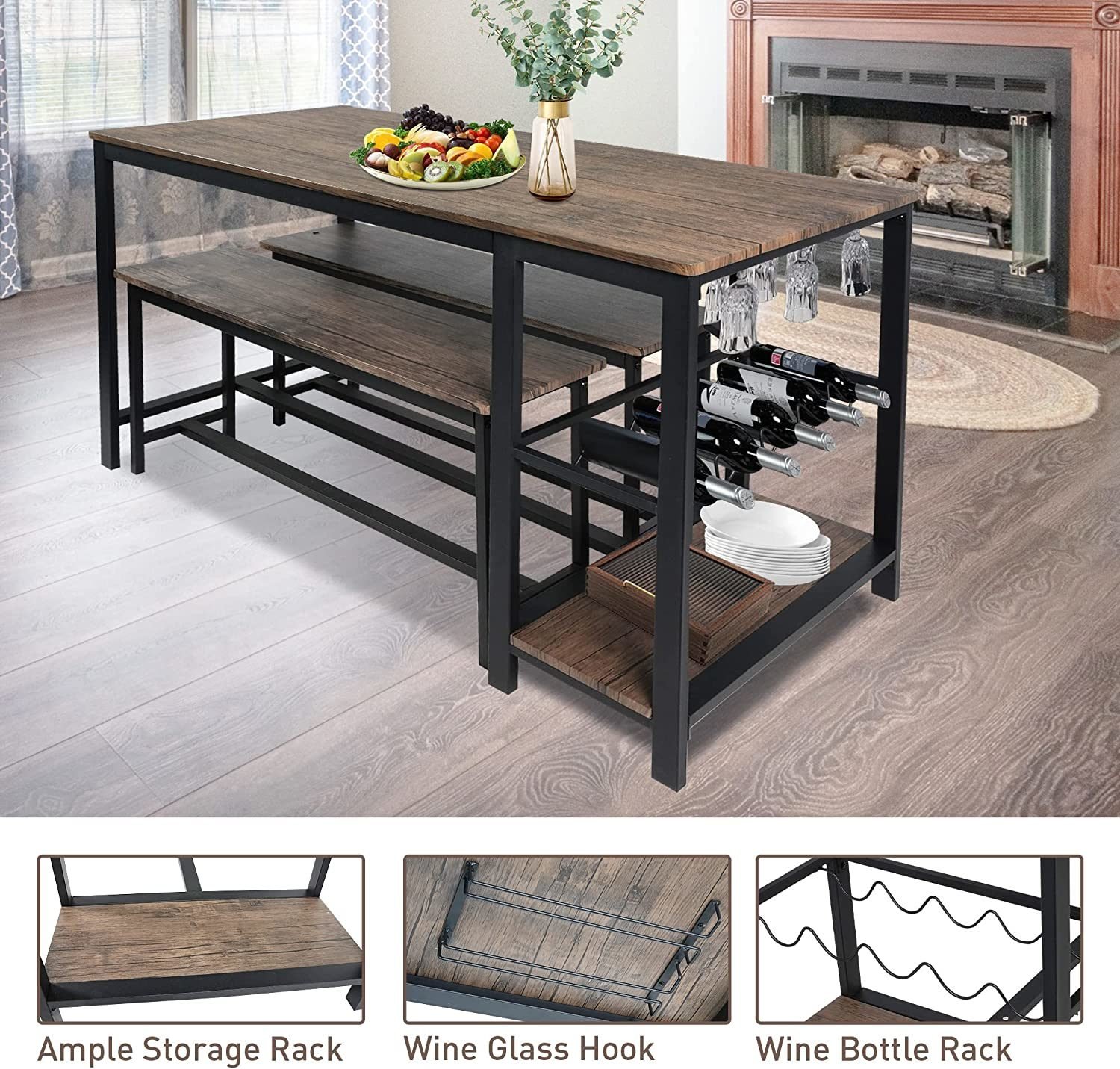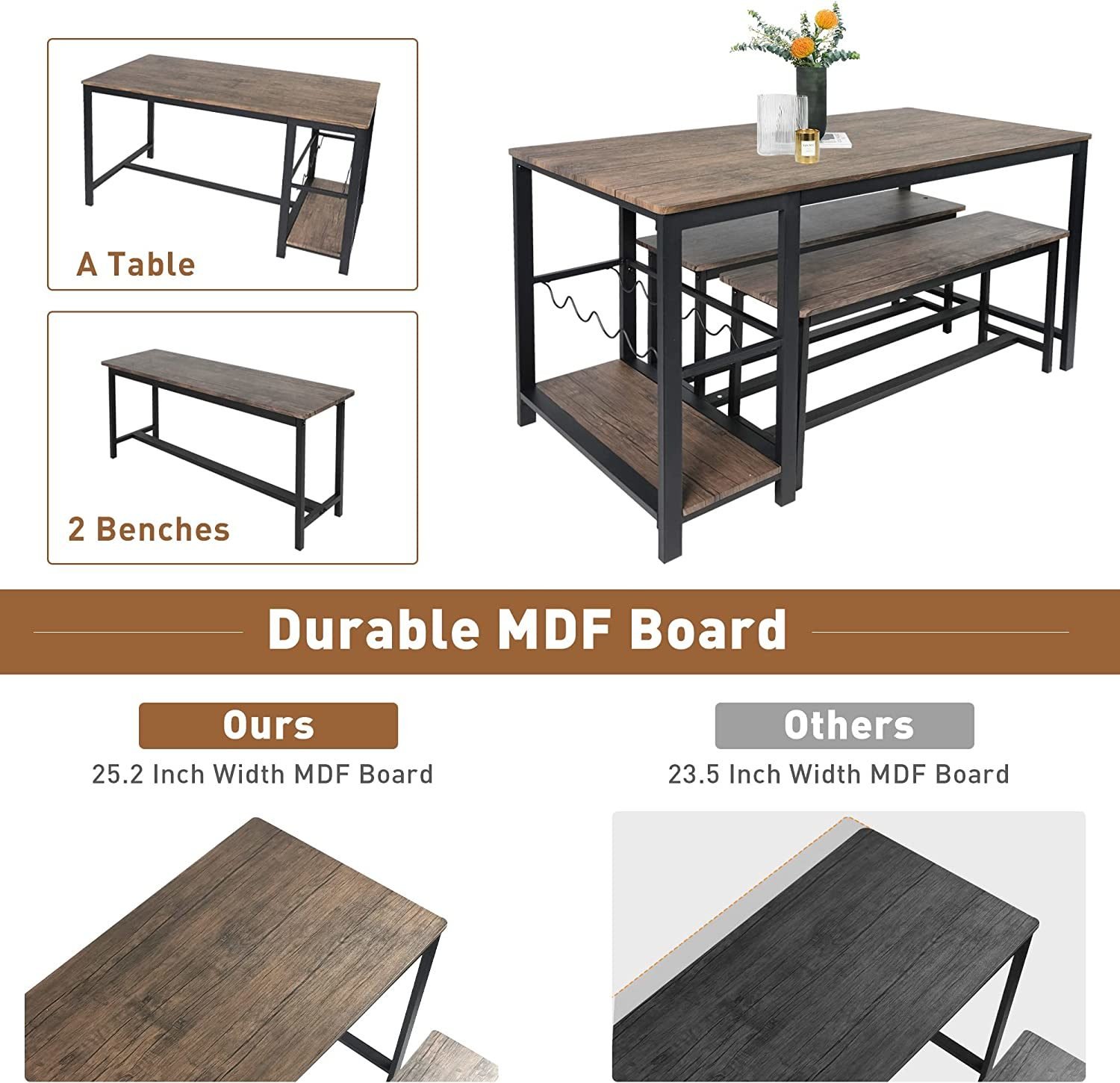 Wider Table Design - Our table is two inches wider than the same one on the market (23.5 inches on the market and 25.2 inches on ours). The Dining Table Set tabletop is made of MDF board and the legs are made of heavy-duty powder-coated metal; which provides the most stability and durability. The Dining Table Set all parts coated with quality waterproof varnish for wear-resistance; anti-scratch; and easy to clean up. Practical Storage - With simple but practical design; this dining table set features wine holders and glass cups hooks for wine or beverage; and wood storage shelve for food; snack or other daily supplies; meeting your various demands and keeping your kitchen tidy and organized. Space-saving Design - Both two benches can be conveniently tucked under the standard height table for space-saving storage while not in use; this dining table set great solution for small spaces; small condos; small kitchens; studio apartments; and more. Simple Assembly - Designed with easy and fast assembly in mind; each dining table set comes conveniently flat packed with easy-to-follow instructions and all necessary screws included. You can easily assemble the desk within 30 minutes. Featuring a smooth surface; our dining room table is easy to be kept clean. Multi Function - This kitchen table and bench for 4 could be widely used as a computer table; dining desk; office table; writing workstations; office workstation; study table; writing desk; gaming desk; bistro table set; etc.