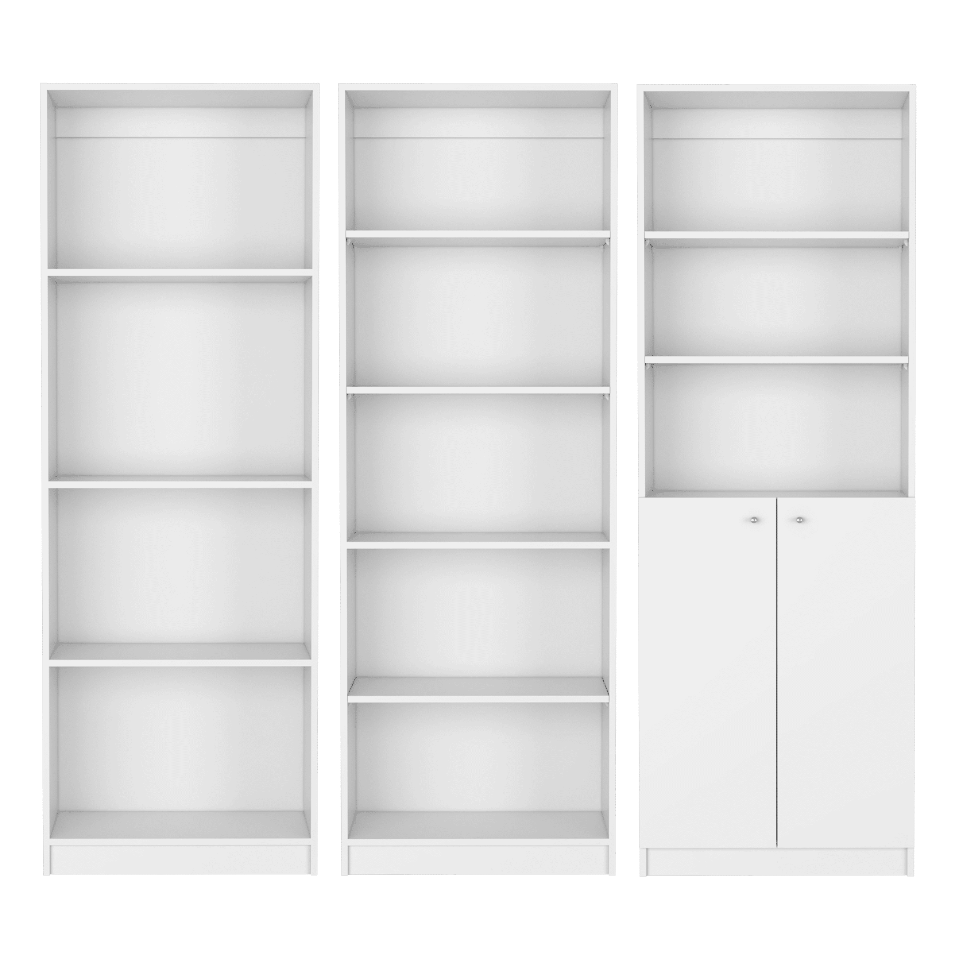 Versatile Storage Options: The set includes a varied range of storage solutions - from the spacious Bookcase Benzoni to the neatly segmented 4 Shelves Bookcase, along with the secure 2-Door Bookcase.