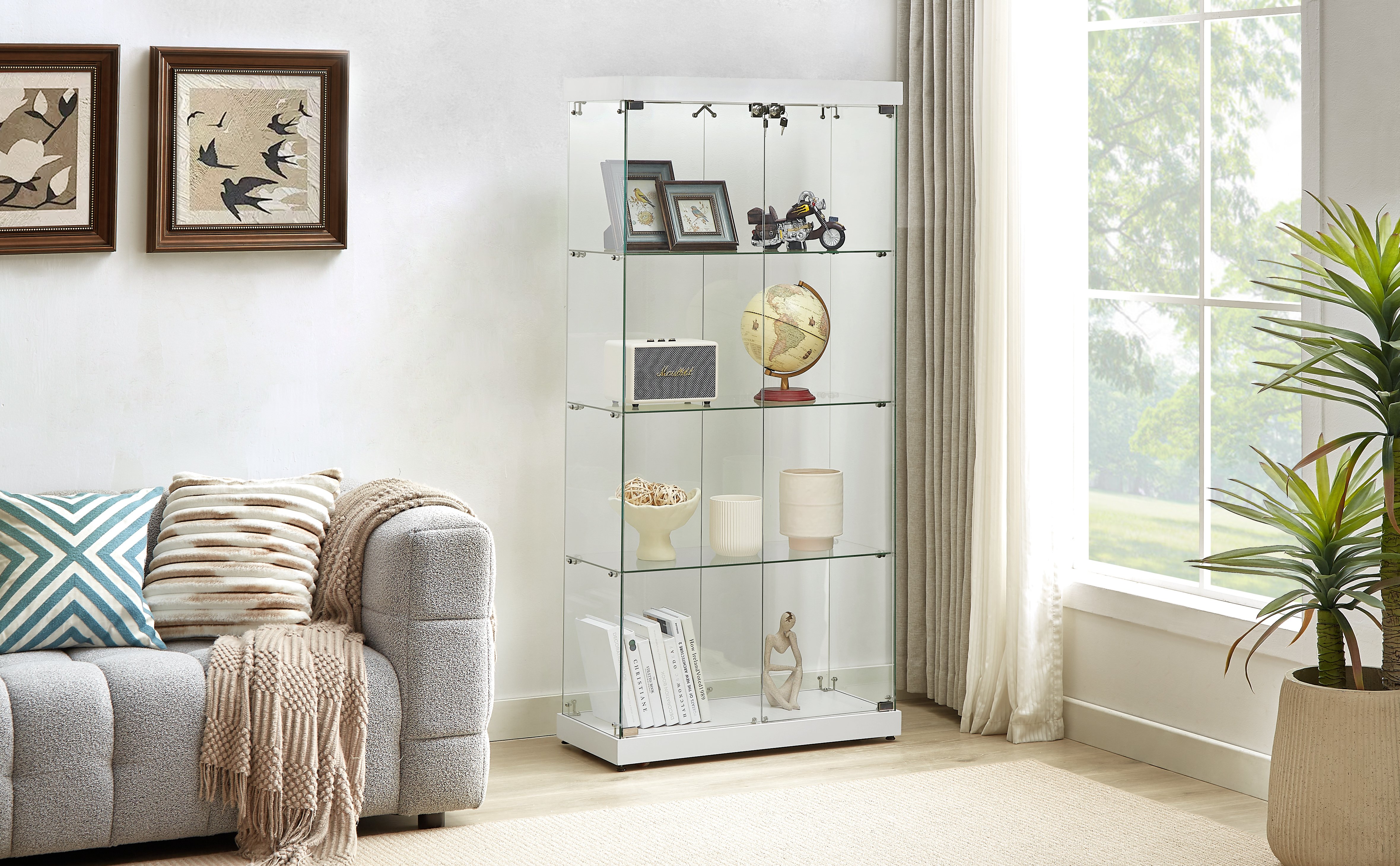 Suitable for a variety of scenes: there are 4 glass partitions to display models, books, albums, wines or trophies; the glass display case can be placed in a variety of occasions such as living rooms, bedrooms, offices, collections or exhibition halls.