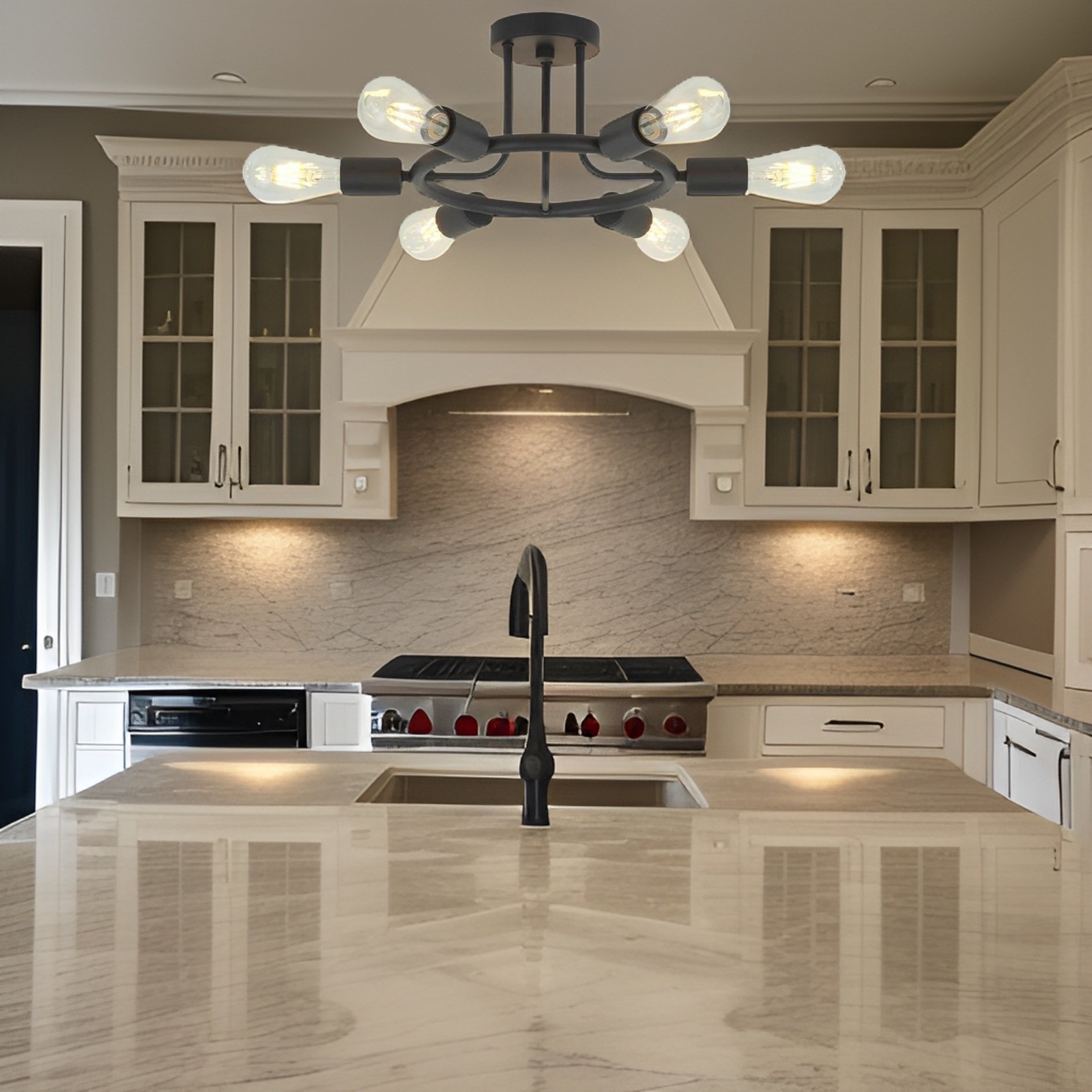 Versatile six-light semi-flush ceiling fixture in black finish, suitable for various room decors; rustic, industrial, and minimalist design in one.