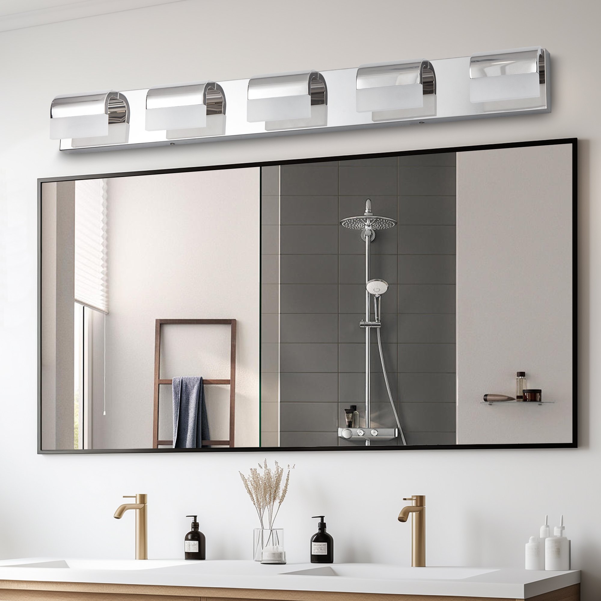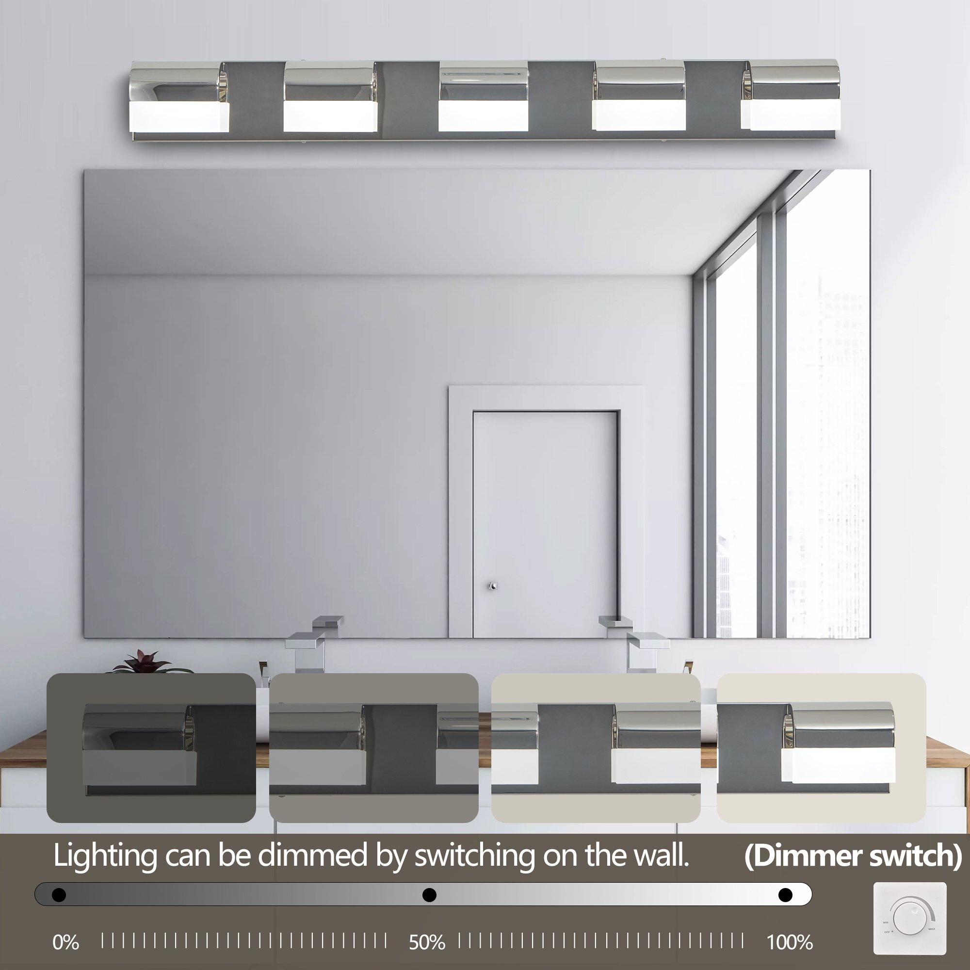 Chrome Modern Bathroom Vanity Lighting 5-Light LED Vanity Lights Over Mirror Bath Wall Lighting*STYLISH AND SIMPLE DESIGN: This chrome bathroom light fixtures has a stainless steel mirror base, acrylic shade and a built-in LED that emits a translucent, bright but not harsh light. *QUICK AND EASY INSTALLATION: This bathroom fixture is very easy to install, all mounting accessories are included in the package, just connect the wires and you can choose to install it up or down according to your preference. The comfortable Soft Light makes your life instantly brighter.