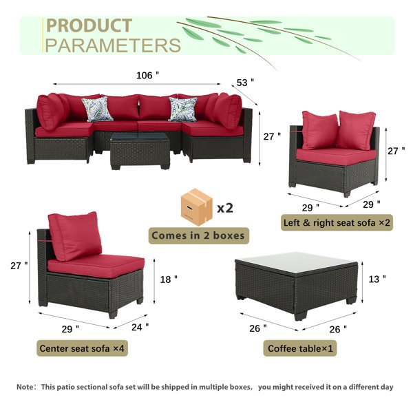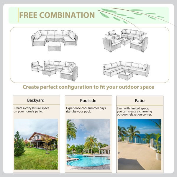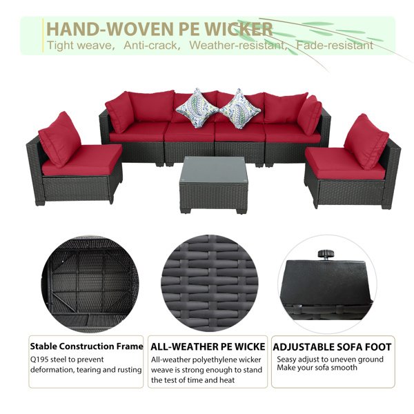 [Easy to assemble]This set of patio furniture features 7 outdoor sectional sofas, including 2 single sofa, 3 middle sectional sofas, and 1 small chair without backrest, 1 tempered glass coffee table with cut-outs underneath to hold books and sundries, extra seat clips to prevent sofas from sliding, adjustable footstool to keep the balance, a comprehensive instruction booklet, and the necessary tools. Simply follow the tutorial for easy installation
