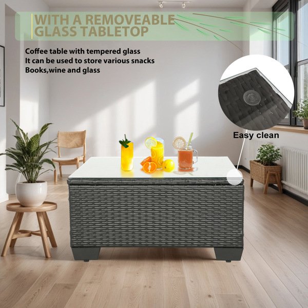 [EASY TO CLEAN AND MAINTAIN]Our outdoor patio furniture tempered glass table top and steel frame support the stability and balance of the sofa.The steel frame is made of Q195 stainless steel, not easy to deform, tear and rust. Removable tempered glass table top, easy to wipe and clean, zip cushion covers are made of high quality fabric, fade-resistant, waterproof and washable.
