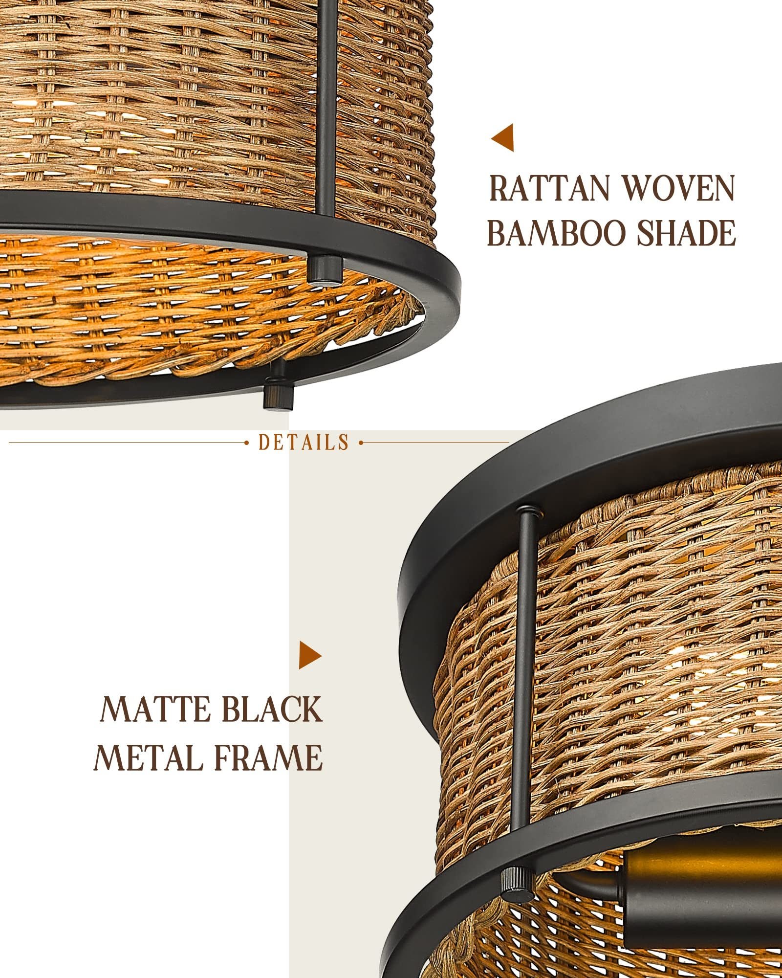 1.Featuring with 100% hand-woven bamboo wicker and matte black light frame. This rattan ceiling light casts 360° light effect shadows through the holes and create a unique cozy glow pattern once turn on. This lighting fixtures ceiling is the perfect combination of bohemian, farmhouse, natural, coastal, minimalist style for home decoration.