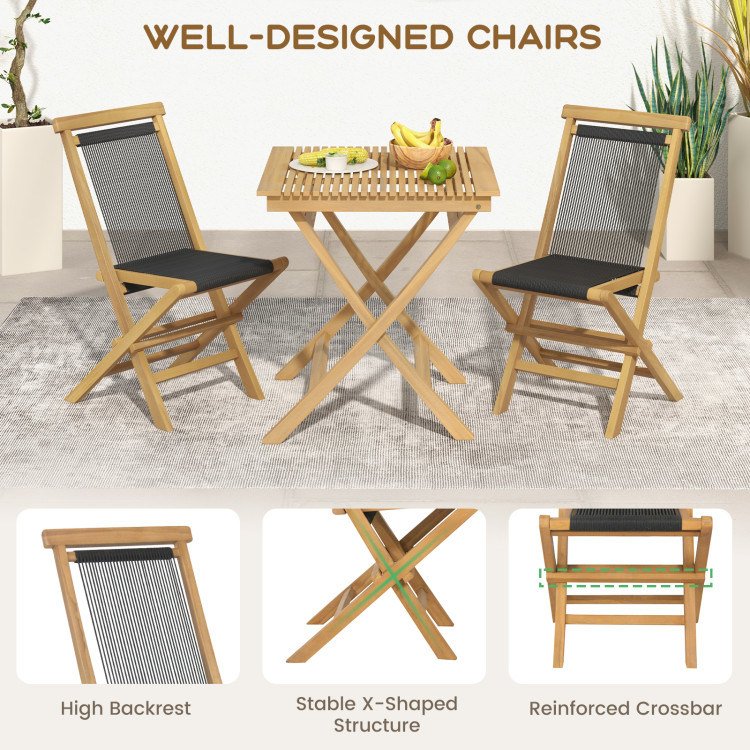 2 Piece Indonesia Teak Patio Folding Chairs with Woven Rope Seat and Back for Porch Backyard Poolside