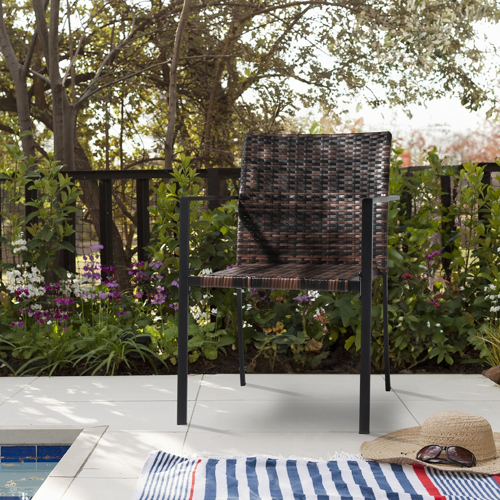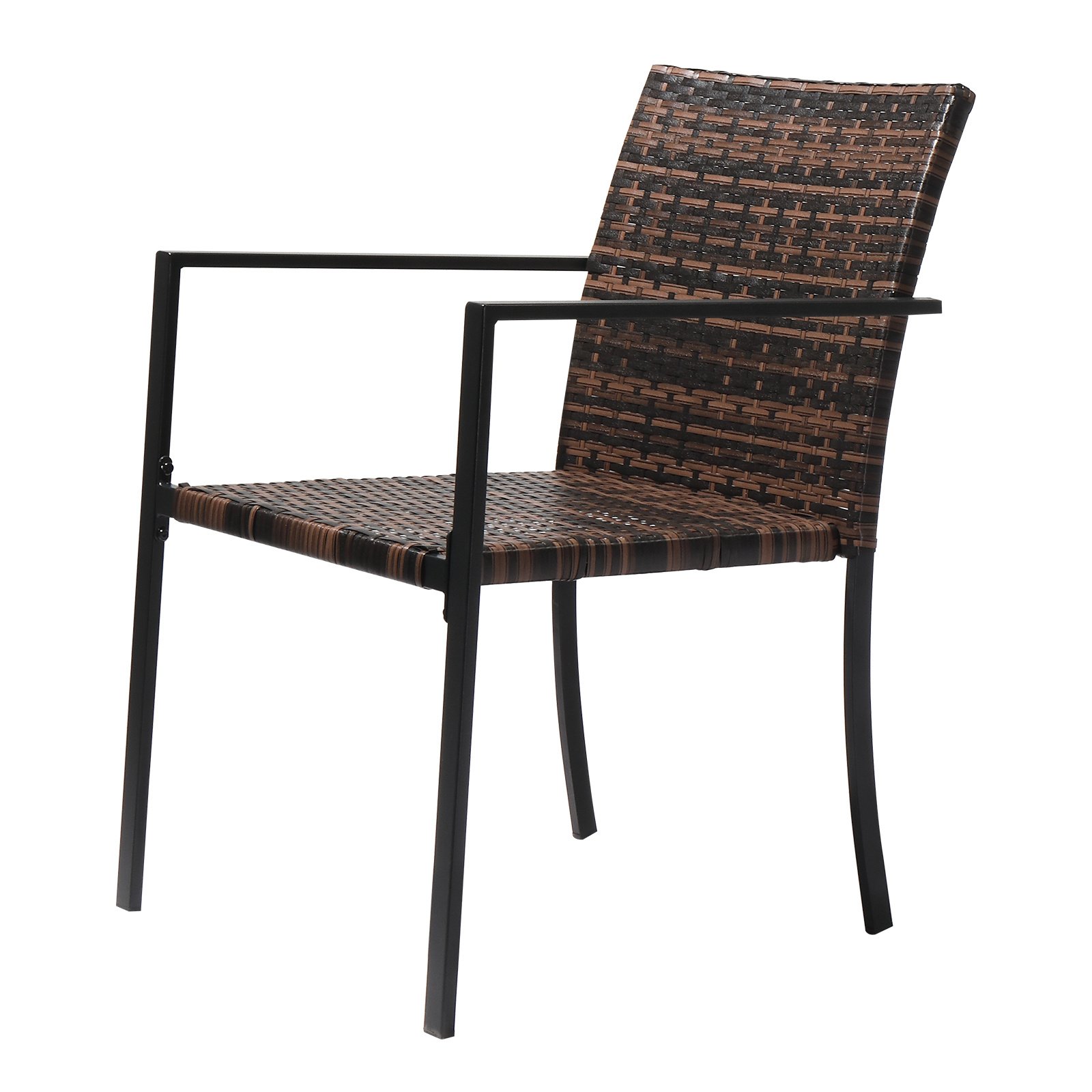 Whether you're hosting a gathering or enjoying a quiet moment outdoors, the Stackable Wicker Dining Chairs are the perfect addition to your outdoor space. These chairs are designed to withstand the elements and provide comfort and style to your patio, deck, garden, or yard. The chairs feature a durable steel frame with a powder-coated finish, ensuring long-lasting use. The all-weather wicker wrapping adds a touch of elegance and resists fading or peeling. With a stackable design, these chairs are easy to store when not in use. The inward sloping backrest and comfortable armrests provide optimal support and relaxation.