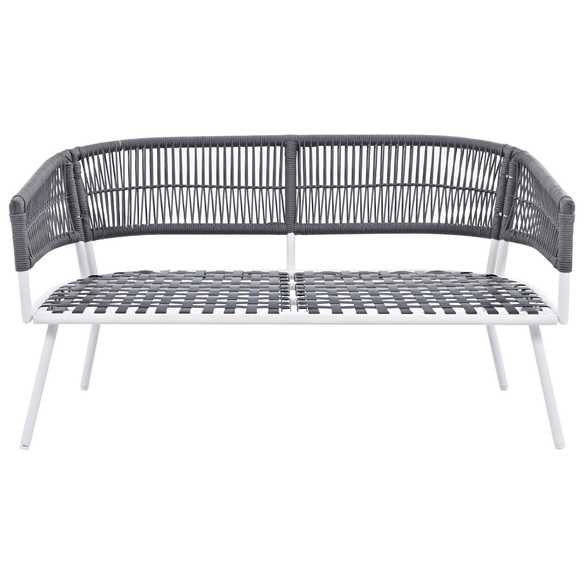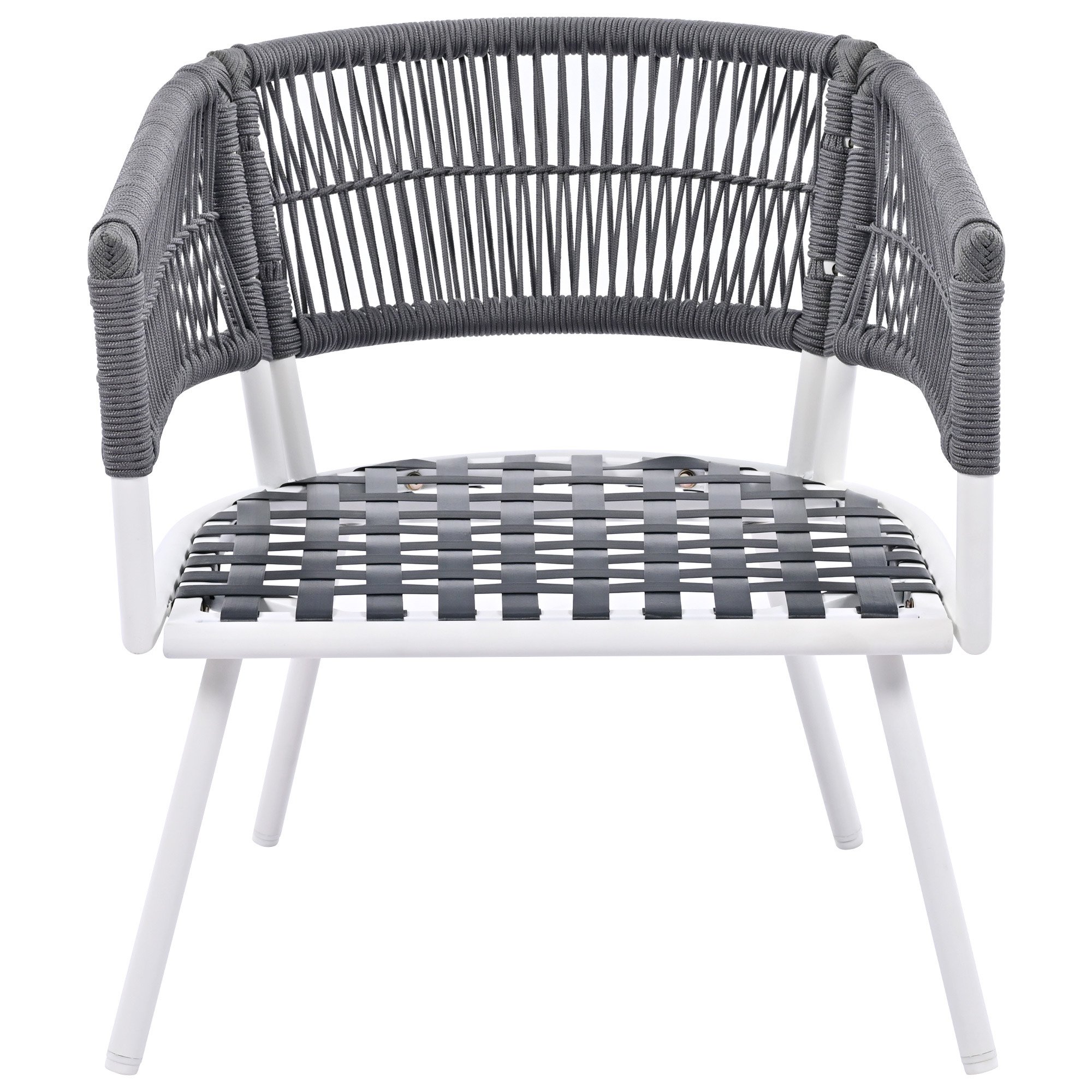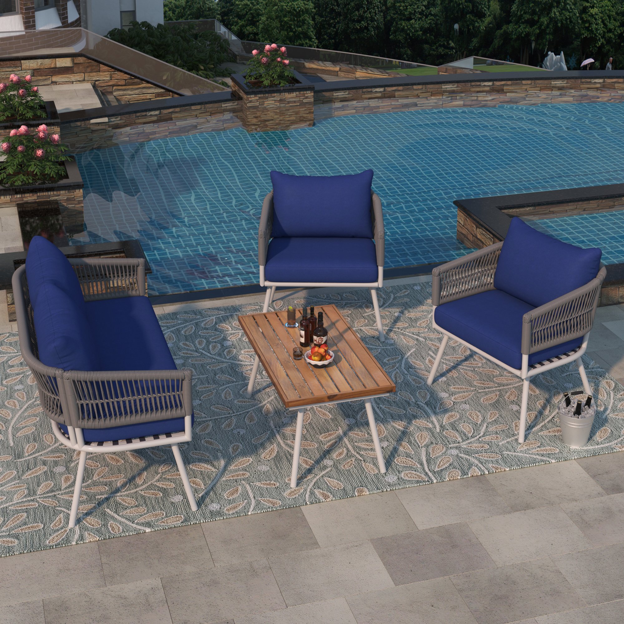 This 4-piece set will give your outdoor space a fresh look that combines modern patio design with classic coastal farmhouse style. It includes one loveseat, two armchairs, and a rectangular acacia wood coffee table - all made from solid metal that's resistant to weather and water damage. The seating features open silhouettes with inviting arms and backs woven from rope for an added touch of natural charm. Plus, the machine-washable covers make clean-up after gatherings super easy!