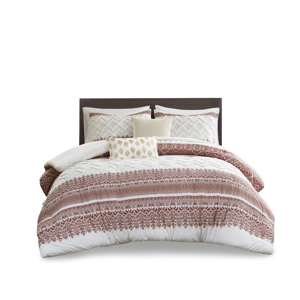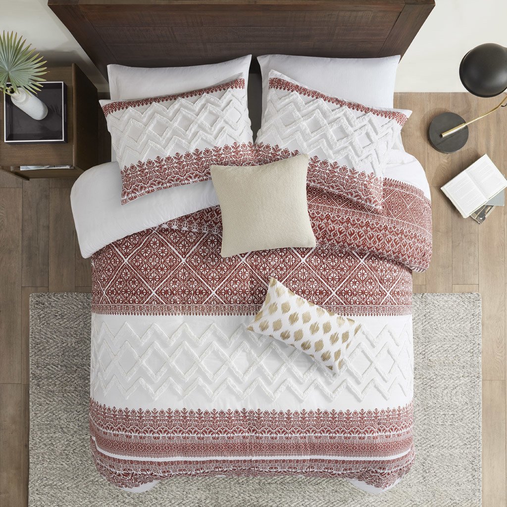 Transform your bedroom with the charming shabby chic allure of the 3 Piece Cotton Duvet Cover Set with Chenille Tufting. The cotton duvet cover flaunts an updated auburn botanic print, on a natural white ground, with tufted white chenille, in a chevron design, to create a charming farmhouse look. A solid auburn reverse complements the top of the duvet cover, while two matching shams beautifully mimic the design on top of the bed, completing the farmhouse duvet cover set. Machine washable, this cotton tufted duvet cover set offers soft comfort and a vivid touch that elevates your bedroom decor. Button closures allow you to place a comforter insert within the duvet cover and inside corner ties help prevent it from shifting. This bedding set is also OEKO-TEX certified, meaning it does not contain any harmful substances or chemicals, ensuring quality comfort and wellness. Insert is NOT included.