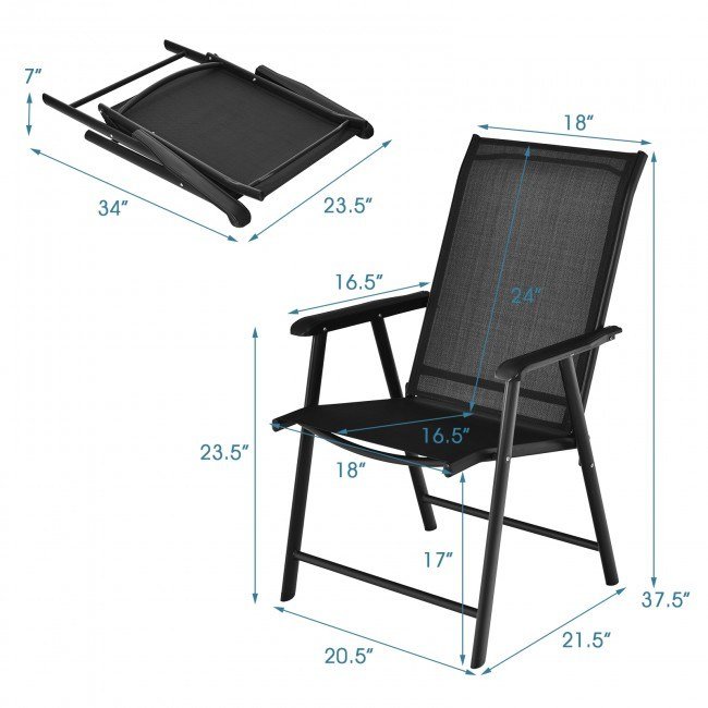 High quality and brand new4 pieces folding textilene chairs with armrestSteel frame; sturdy and durableFolding feature; easy and simple to store or transportPerfect for family gathering; party and outdoor campingNo assembly need